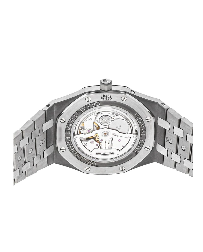 Pre-Owned Audemars Piguet Royal Oak Perpetual Calendar Ultra-Thin (26586IPOO1240IP01) self - winding automatic watch, features a 41mm titanium case surrounding a blue dial on a titanium bracelet with folding buckle. Functions include hours, minutes, day, date, month, moon phase, leap year indicator and perpetual calendar. This watch comes complete with box and papers. Time remaining on the factory warranty!