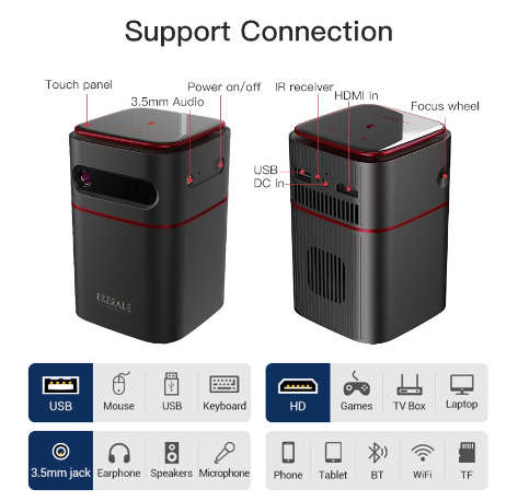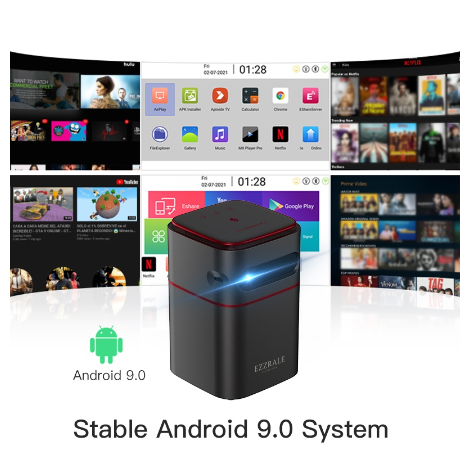 Fitur Utama Proyektor Ezzrale Deimos I: 1. Smart Sistem Android 9.0 Deimos Version Exclusive 2. Mini Cube Pocket (easy to carry anywhere) 3. Built in battery 7200 mAh (real), Daya tahan full 1.5 up to 2 hours 4. DLP Sistem high contrast 5. Bisa menjadi bluetooth speaker 1*5W Surround Stereo Dolby Sound. 6. Bisa bluetooth ke semua speaker external (BT 5.0) dan mirroring ke semua Smartphone (IOS/Android) 7. Fitur LED Touch pannel pada permukaan proyektor. 8. Auto keystone correction , Trapezoid System correction, Manual correction can be used too. 9. Bisa jadi Powerbank MAIN SPECIFICATION: Brand : Ezzrale Model : Deimos I SKU code : D042 Projection Technology: DLP System Light Source : RGB LED Brightness: 150 ANSI Lumenious Lamp Life cycle : 30.000 Hours Native Resolution : 854*480 Support Resolution: 4K (max decoding) Projection Ratio : 1,2:1 Projection Distance: 0,5m - 4,5m Projection Size Screen: 10" - 120" (Recommendation Projection) Contrast: 2000:1 Aspect Ratio : 16:9/4:3/16:10 Luminance Uniformity: More than 85% Distortion: less than 1% Focus Mode: Manual Keystone Correctrion: Auto Correction, Vertical +- 40 degrees, Manual angle correction Projection mode: Front, Rear Ceiling, Rear Ceiling. Offset Function: NO SYSTEM PARAMETER: Android : 9.0 Deimos Version Control Method: Touch Key Pannel, RC, Remote, Smartphone Screen Mirroring: Wired / Wireless Connection CPU : RK3228A, Quad Core, Cortex A7 , 1,2 Ghz GPU: Mali400 MP2 RAM/ROM : 2GB DDR3 / 16GB WIFI: 2,4G/5G IEEE 802.11 a/b/gn/ac Bluetooth: BT 5.0 BASIC PARAMETER: Speaker: 1*5W Battery: 7200 mAh (1.5 Jam) Charging time : 300 Minutes Power : DC 12V 2A Engine / Projection Power: 7W/12W Audio Format: MPEG-1,MPEG-2(Layer I/II), MP3, Dolby, Digital (AC-3) Optional, AAC-LC, HE-AAC, WMA Video Format: MPEG-2, MPEG-4, RM, RMVB, WMV, VC1 Picture Format: jpg, png, bmp etc Interface: 1* USB 2.0, 1*HDMI input, 1*Audio out 3,5mm, 1*DC-in, Tripod mount (ada dibagian bawah proyektor) Dimention Info: Weight/Berat: 390 grams Projection dimention: 7,2 x 7,2 x 10,6 cm Gift Box / packaging: 20,6 x 16,5 x 8,5 cm Projector Content: - Projector Deimos I - Adapter Charger - HDMI cable 1,5 meters - Free Tripod Alumunium Stand. - Manual Book - Warranty Card