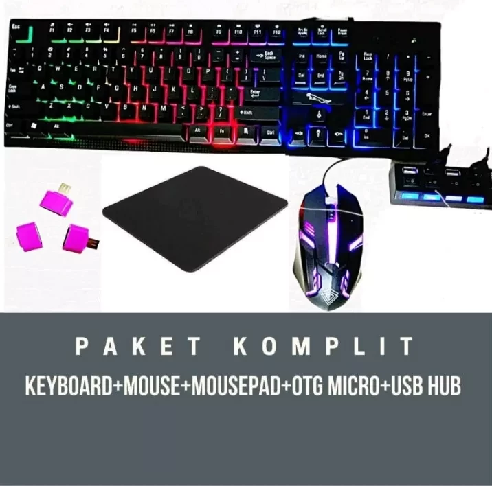 COMPLETE PACKAGE CONTENTS1 x GAMING KEYBOARD LED1 x GAMING MOUSE LED1 x OTG MICRO1 x MOUSE PAD1 x USB HUB 4 PORT 2.0 SAKLAR ON/OFF