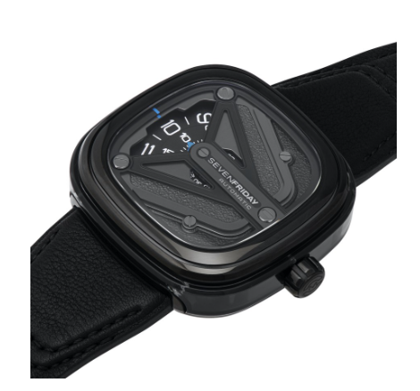 Dial: 5 layers construction, alternately treated with jet black and gun metal grain stamping. 9 applied