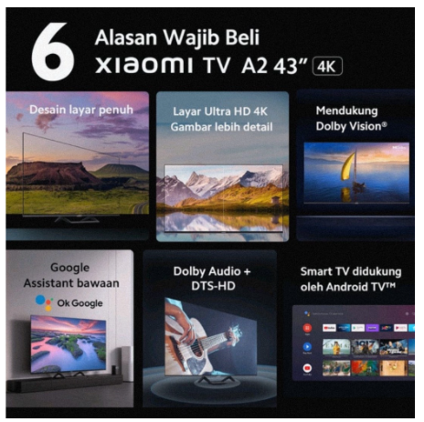 Perhatikan, Pembelian mohon chat terlebih dahulu karena proses pengiriman menggunakan kurir toko. terima kasih PEMBELIAN KHUSUS DENPASAR, BADUNG, GIANYAR, DAN SEKITARNYA PILIH UKURAN TV YANG DIINGINKAN Gratis Bracket!!! untuk Pemasangan di Dinding bisa chat Xiaomi TV A2 43 4K memiliki desain bezel ultra-tipis menghadirkan rasio antara layar dan bodi yang jauh lebih baik dibandingkan TV standar. Ketika layar dinyalakan, Anda hampir tidak merasakan adanya garis di sisi gambar sehingga bisa menikmati pengalaman visual yang lebih imersif. Dengan desain bingkai metalik yang keren dan menyatu, Xiaomi TV A2 Series semakin menambah kesan serasi dengan setiap ruangan rumah. Spesifikasi: Layar Tipe Layar: UHD 4K Resolusi: 3840 2160 Gamut warna: DCI-P3 90% (umum) Kedalaman warna: 1,07 miliar Refresh rate: 60Hz MEMC: hingga UHD 60Hz Sudut tampilan: 178(H)/178(V) Mendukung Dolby Vision, HDR10, HLG Speaker Speaker (Output Suara): 2 12 W Mendukung Dolby Audio dan DTS-HD Sistem Operasi Android TV 10 CPU: Quad A55 GPU: Mali G52 MP2 RAM: 2GB Penyimpanan: 16GB Konten Netflix, Amazon Prime Video, dan YouTube bawaan Ribuan aplikasi tersedia di Google Play